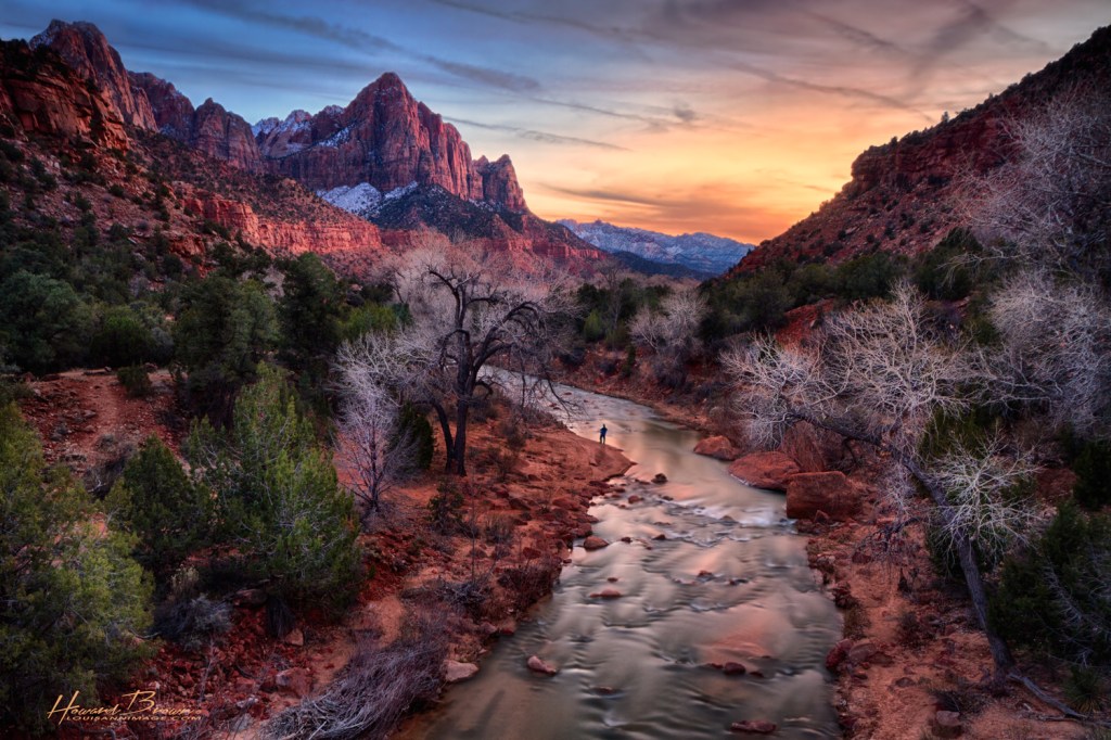 Utah’s Zion National Park –– Go, immerse yourself, spend many a day on countless trails. Find cliffs where vistas consume the imagination. Walk knee deep in her rock filled and icy waters. Listen to the mountain melody of birdsong and breeze wafting through Cottonwood grove on the valley floor. See the mist of morning and the fire of gold fade to azure blue at dusk. Make footprints in the snow beside that of the Mule Deer and Jackrabbit. Gaze upward to witness Bristlecone Pine cling to crevased sandstone more than a thousand feet above –– up there at the edge of forever. Know then, that this place has an author, a creator, an architect of the most devine. Time, wind and water –– sculptors of the most accomplished.