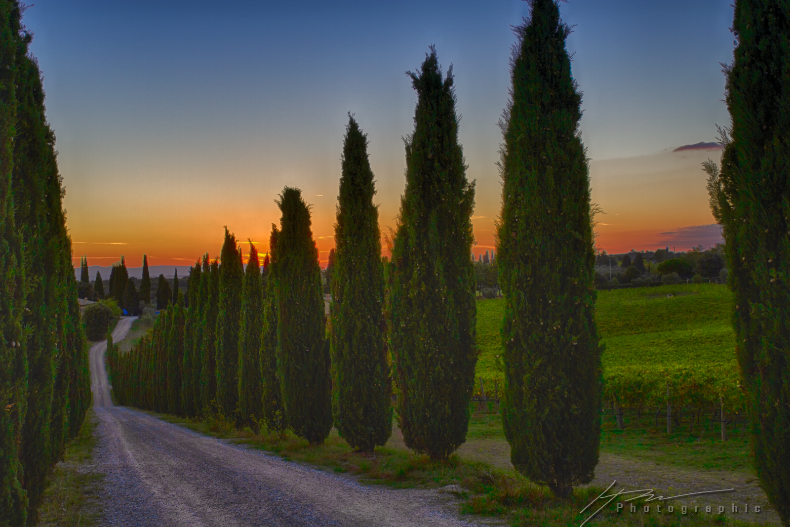 It is dusk. Walk among the Tall Trees. A royal species –– this Italian Cypress. They stand elegantly in respect of this Paradise on Earth. Some now centuries old, Tall Trees were planted by the Tuscans to celebrate the way home, to mark vineyard, crop and grove and just simply, to be creative. They line the rolling hills and farmed patchwork to the horizon like Ceasars ancient legions marching single file in defense of the land… and life itself. Let the Tall Trees take your breath away. It is then that one will feel the sense of envy – if only for a moment, because down deep you want to live like a Tuscan, you wish you were, a Tuscan. Push reality aside as long as you can and live in this moment. Revel in it. Put its memory in a special place in your heart –– because you will depart. You will return to your world, your responsibilities, your obligations, your existance. Because, yes, you love your own way of life. But still, you’ve realized you were not among the chosen ones for a life in this place, this Paradise.